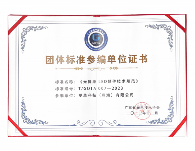 In December, 2023, it became a participating entity in the compilation of the group standard “Technical Specification for Light Health LED Devices” by Guangdong Photoelectric Technology Association.